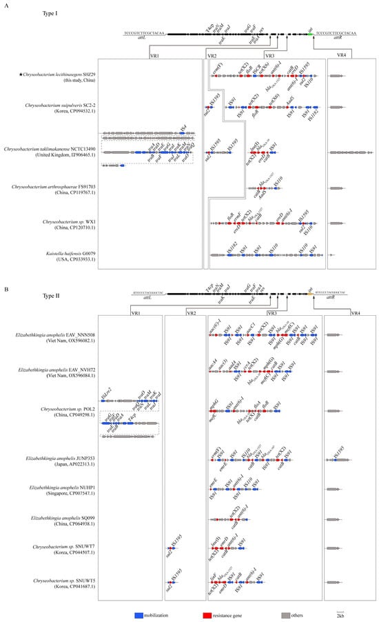 Background/Objectives: The global dissemination of tet(X) variants critically threatens tigecycline efficacy as a last-resort antibiotic. The aim of this study was to characterize a tet(X6)-carrying integrative and conjugative element (ICE) in a multidrug-resistant Chryseobacterium lecithinasegens strain, SHZ29, isolated from Shanghai, China. Methods: Minimum inhibitory concentrations (MICs) were determined by broth microdilution for SHZ29. Whole genomic sequencing and bioinformatic analysis were performed to depict the structure of the novel tet(X6)-carrying ICE. Inverse PCR and conjugation experiments were conducted to investigate the transfer ability of the ICE. Results: We depicted a novel tet(X6)-carrying ICE, named ICECleSHZ29, which is 74,906 bp in size and inserted into the 3′ end of tRNA-Met-CAT gene of the C. lecithinasegens strain SHZ29, with 17 bp direct repeats (5′-tcccgtcttcgctacaa-3′). This ICE possesses a 38 kb conserved backbone and four variable regions (VR1-4), with VR3 aggregating multiple resistance genes, including tet(X6), tet(X2), erm(F), ere(D), floR, catB, sul2, ant(6)-I and blaOXA-1327. NCBI database searching identified 13 additional ICEs sharing a similar backbone to ICECleSHZ29. These ICECleSHZ29-like ICEs could be classified into two types based on their distinct insertion sites: Type I, inserted at the tRNA-Met-CAT gene; and Type II, inserted at the tRNA-Glu-TTC gene. Phylogenetic analysis indicated that differences in integrases may result in differences in the insertion site among these ICEs. A circular intermediate form of ICECleSHZ29 was detected by inverse PCR. However, the conjugation experiments using Escherichia coli EC600 as recipients failed. Conclusions: To our knowledge, this study provides the first report of tet(X6) in C. lecithinasegens and characterizes its carrier, a novel ICE: ICECleSHZ29.