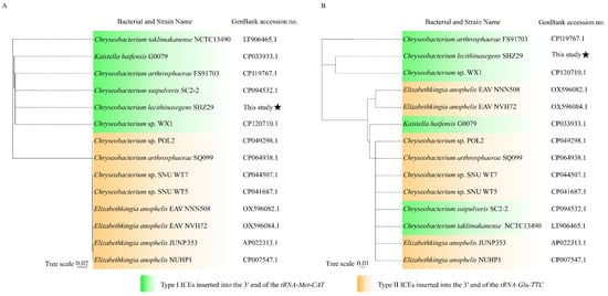 Comparative analysis of these ICECleSHZ29-like ICEs revealed that they shared a conserved structural backbone. However, further bioinformatic analysis demonstrated that these ICEs could be classified into two distinct types based on their distinct insertion sites, designated as Type I and Type II (Figure 1). Type I ICEs insert at the 3′ end of the tRNA-Met-CAT gene, forming a perfect 17 bp direct repeat (5′-tcccgtcttcgctacaa-3′) at both insertion junctions (Figure 1A). By contrast, Type II ICEs insert at the 3′ end of the tRNA-Glu-TTC gene, generating a perfect 17 bp direct repeat (5′-attcccctacgggctac-3′) at both insertion junctions (Figure 1B).