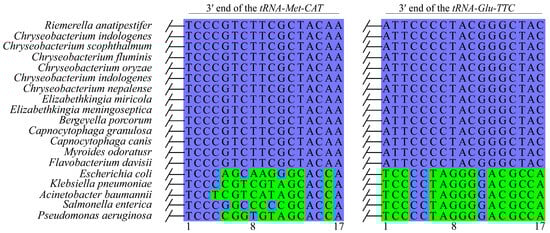 Comparison of the 3′ end sequences of the tRNA-Met-CAT and tRNA-Glu-TTC of different bacteria species. Blue and green indicate conserved and variable sequences, respectively.