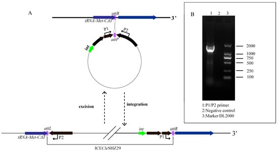 (A) Schematic diagram of the integration and excision of the ICECleSHZ29. (B) PCR detection of the circular form of ICECleSHZ29. The lane numbers and primer set are also shown.