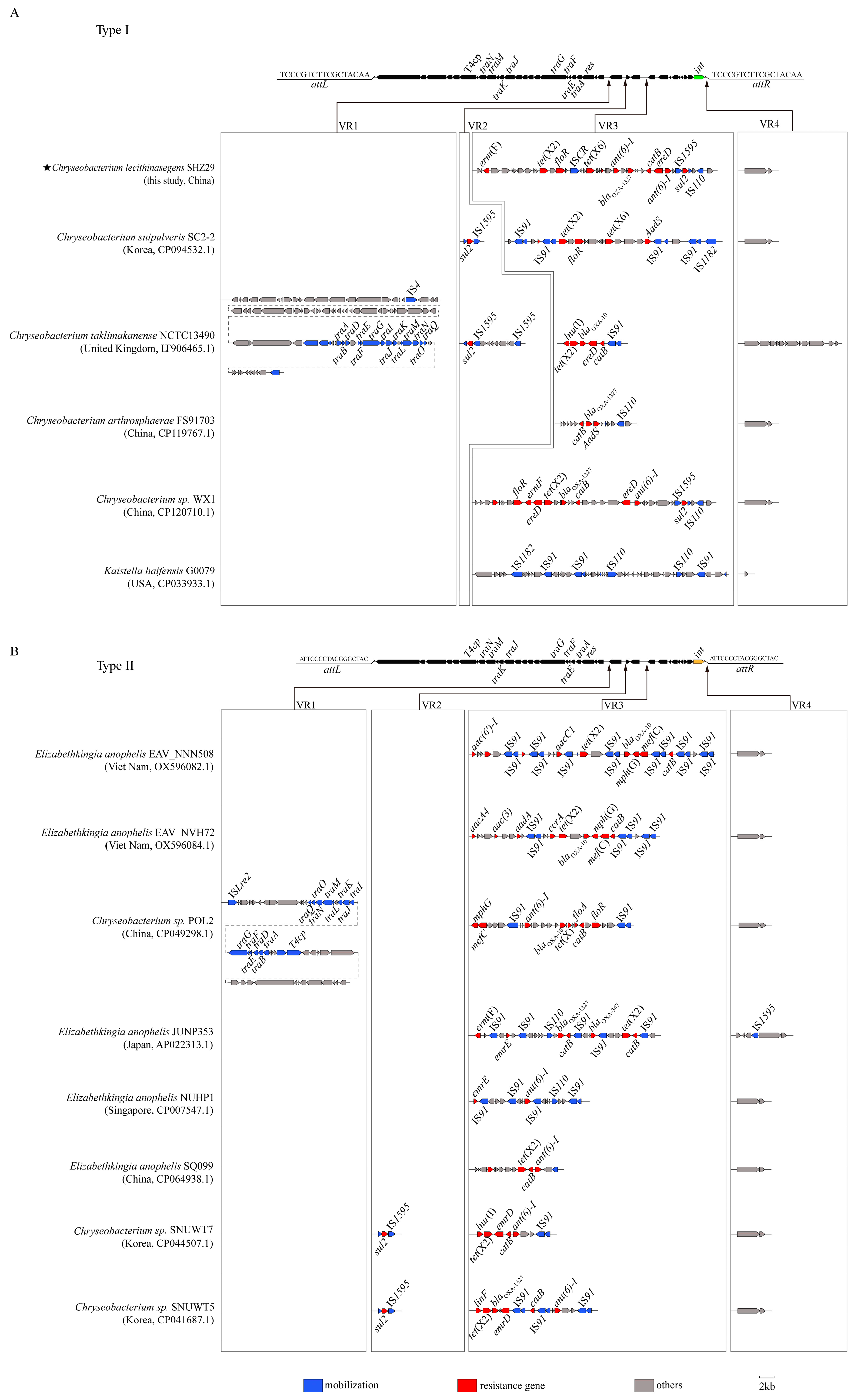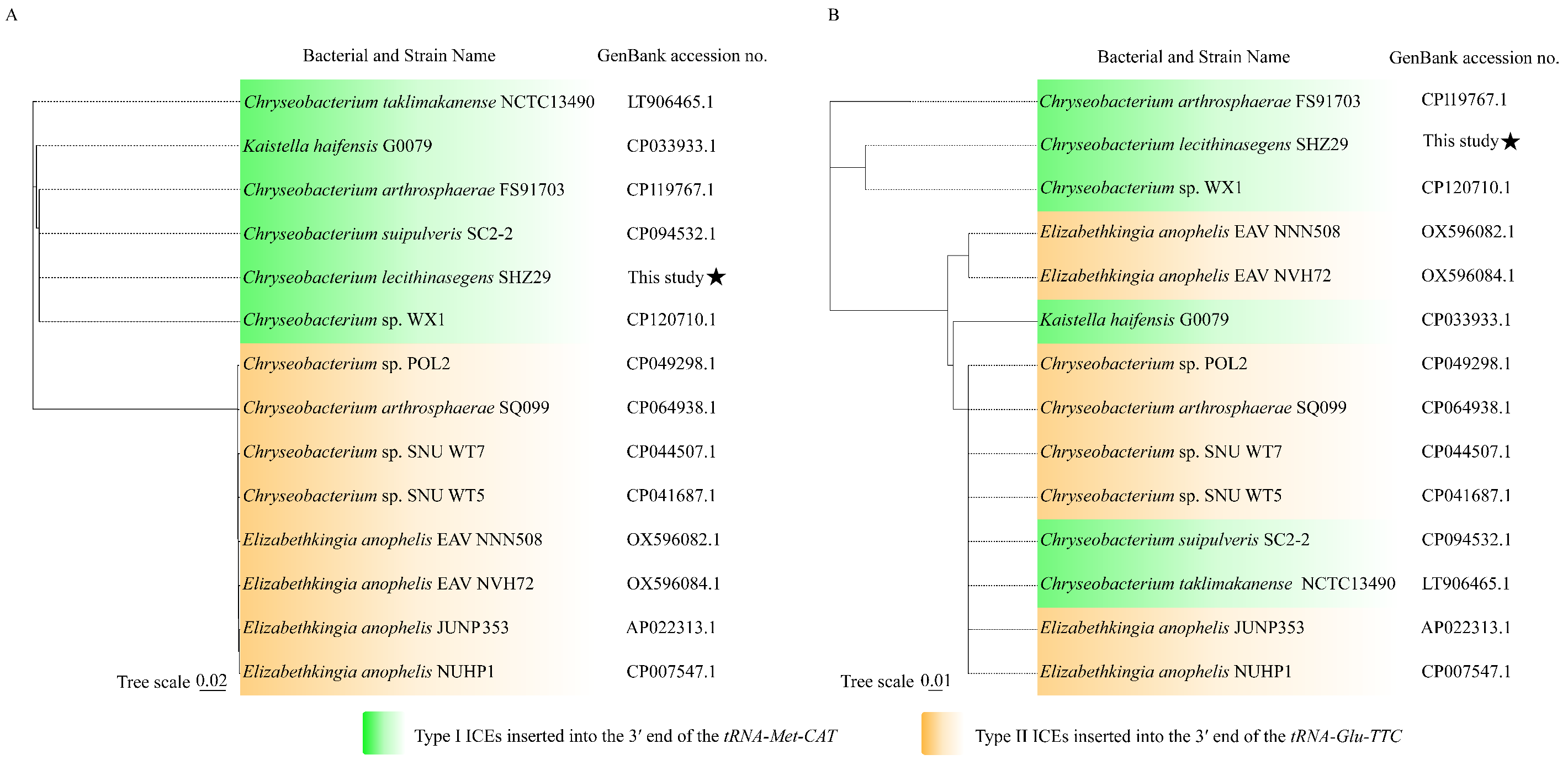 - Fu, J.; Zhong, C.; Zhou, Y.; Lu, M.; Zong, G.; Zhang, P.; Cheng, M.; Cao, G. The Integrative and Conjugative Element ICECspPOL2 Contributes to the Outbreak of Multi-Antibiotic-Resistant Bacteria for Chryseobacterium Spp. and Elizabethkingia Spp. Microbiol. Spectr. 2021, 9, e0200521. [Google Scholar] [CrossRef]