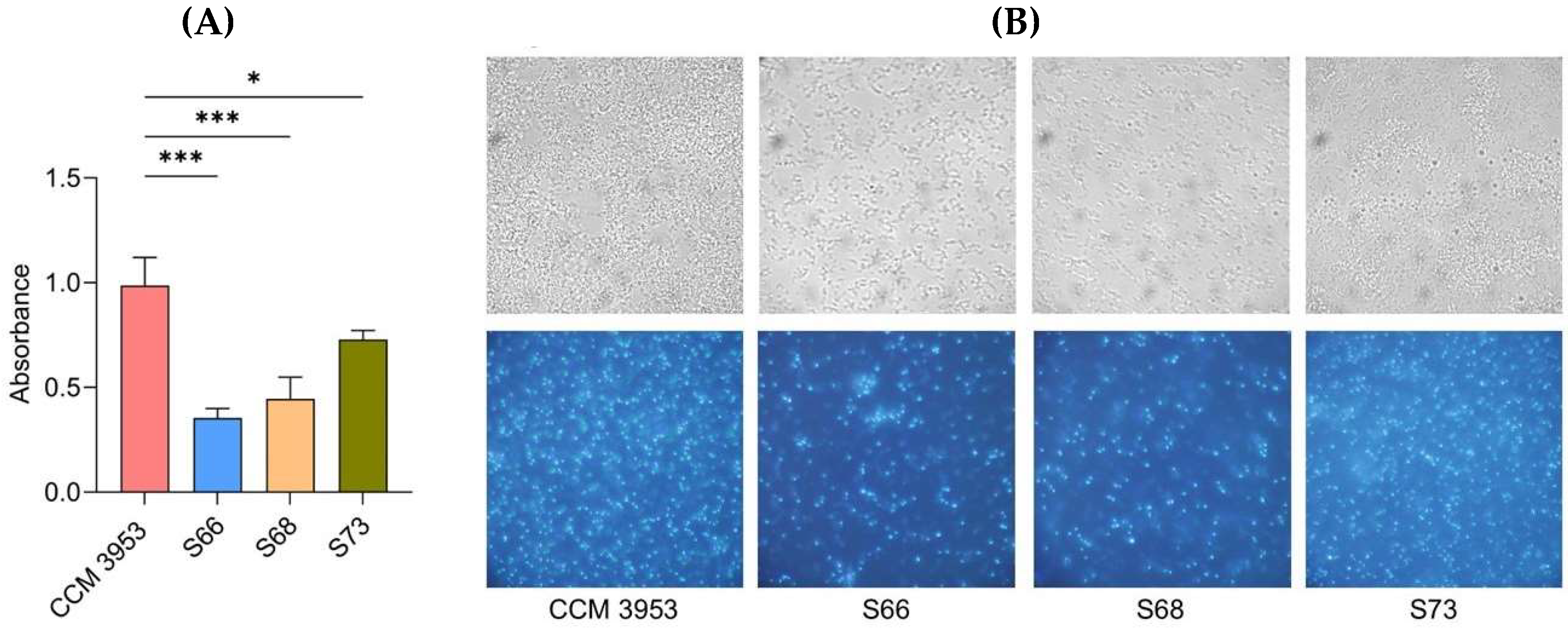 The ability to form biofilm was assessed by crystal violet assay (Figure 3A) and supported by microscopic observation (Figure 3B). The results, summarized in Figure 3A, showed that the standard strain CCM 3953 and agr-negative MRSA strain S73 were strong biofilm producers, while the agr-positive strains S66 and S68 produced less biofilm. Fluorescence microscopy with DAPI staining confirmed dense and compact biofilm layers of strains CCM 3953 and S73. On the other hand, the agr-positive strains S66 and S68 formed scattered biofilm clusters with low density (Figure 3B).