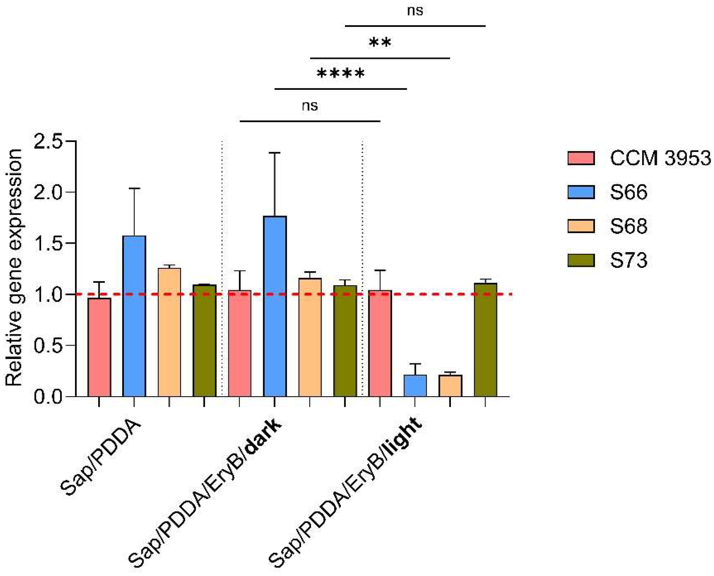 Figure 5. Relative expression of the hld gene on nanomaterial in 24-h biofilms before and after irradiation. The red line represents the control S. aureus biofilm for each strain formed on PU alone (set as 1); the rpoD gene was used as a housekeeping gene. Control sample with EryB but cultivated in the dark is labeled dark, and sample irradiated with a green laser for 10 min is labeled light. A p > 0.05 (ns) was considered non-significant; p < 0.01 (**) was very significant; and p < 0.0001 (****) was extremely significant.