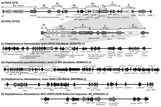 Whole-genome sequencing showed that the ST42 isolate SH51 harbored a SCCmec cassette approximately 12,000 bp in size, comprising orfX, heavy-metal resistance genes (cadD, cadX, arsC, arsB, arsR), IS431, mecA, paaZ, ugpQ, IS431, copA, and ydhK (Figure 1b). In contrast, the ST3 isolate SH53 possessed a larger SCCmec cassette (~32,000 bp), including orfX, Mod, PRK15483, helicase, ADP-ribosylglycohydrolase, ydjH, SMP2 superfamily, YafY superfamily, heavy-metal resistance genes (cadD, cadX, arsC, arsB, arsR), IS431, mecA, paaZ, ugpQ, PksG superfamily, IS431, copA, and ydhK (Figure 1a). In GenBank, the SCCmec cassette of S. haemolyticus strain WCH1 (GenBank: JQ764731.1) and Staphylococcus pseudintermedius strain 57395 (GenBank: HE984157.2) encode all of the aforementioned heavy-metal resistance genes (cadD, cadX, arsC, arsB, arsR, and copA) (Figure 1c and Figure 1d, respectively), whereas S. haemolyticus strain SH621 (GenBank: AB478934.1) contains only cadD, arsC, arsB, and arsR, lacking cadX and copA (Figure 1e). Notably, S. haemolyticus strain ATCC29970 (RefSeq: NZ_CP035291.1) carries mecA only and lacks other SCCmec-associated components (Figure 1f).