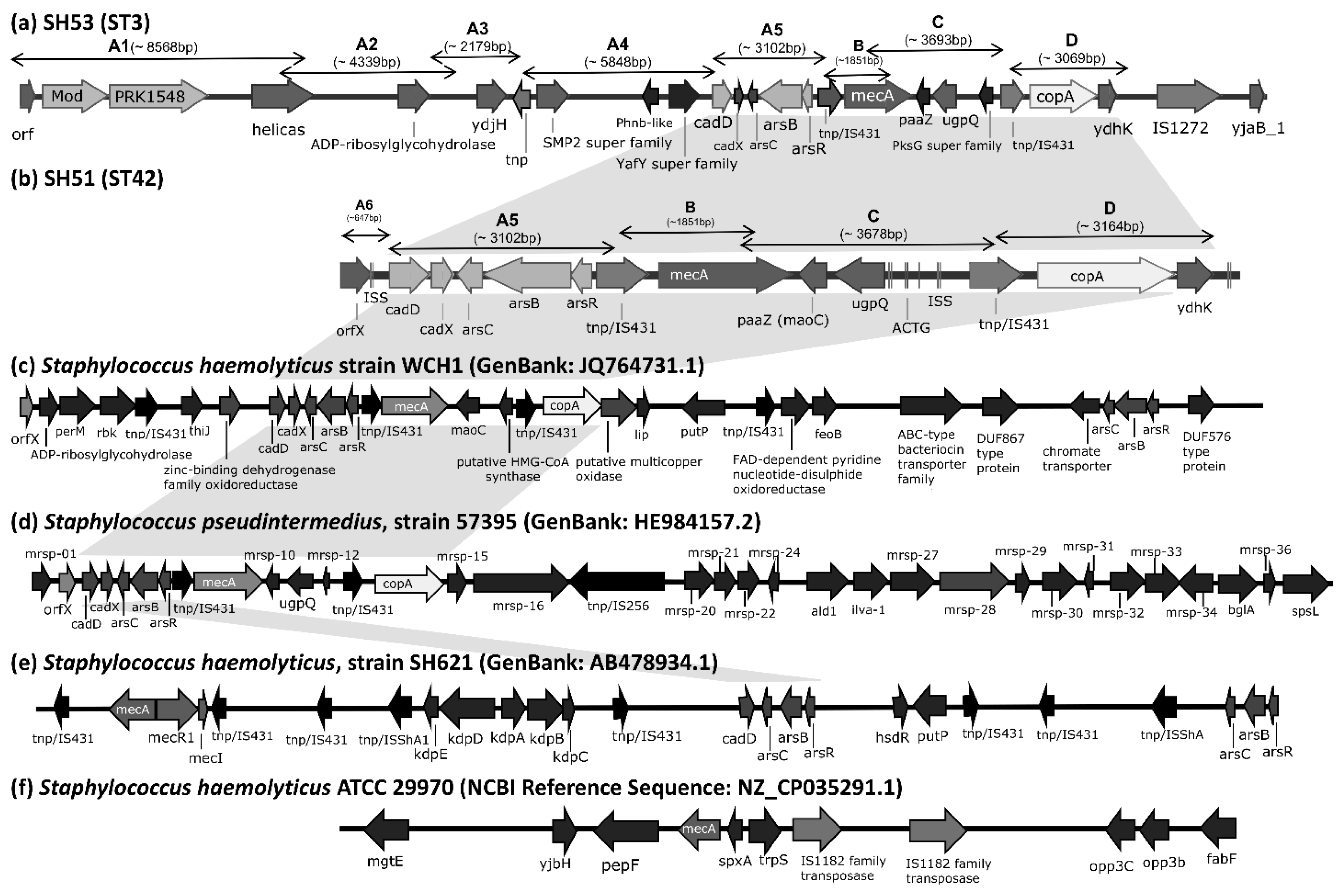 - Zong, Z. Characterization of a complex context containing mecA but lacking genes encoding cassette chromosome recombinases in Staphylococcus haemolyticus. BMC Microbiol. 2013, 13, 64. [Google Scholar] [CrossRef]