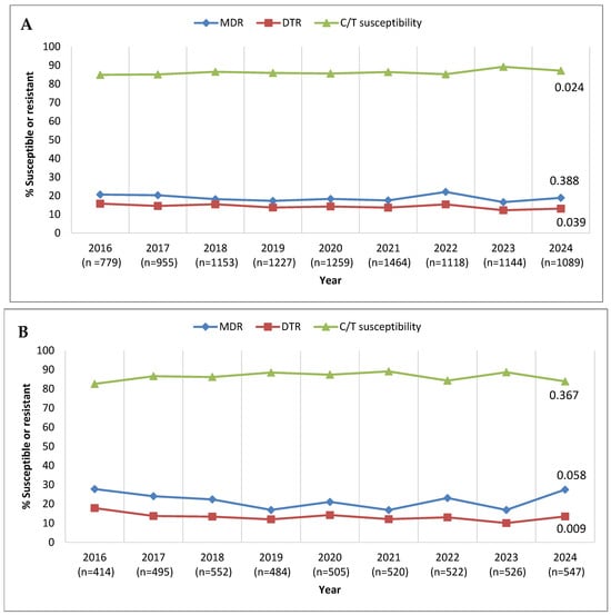 Longitudinal trends from 2016 to 2024 in the percentage of P. aeruginosa isolates identified as multidrug-resistant (MDR), difficult-to-treat resistant (DTR), and ceftolozane/tazobactam-susceptible (C/T-susceptible) among (A) all isolates collected in Latin America and (B) isolates collected from clinical sites that participated in the SMART program each year from 2016 to 2024. Significance in trends over time was determined by the Cochran–Armitage test: two-tailed p-values are shown in the figure (p < 0.05 was considered statistically significant). Percentages presented in this figure are provided in Supplementary Table S2.
