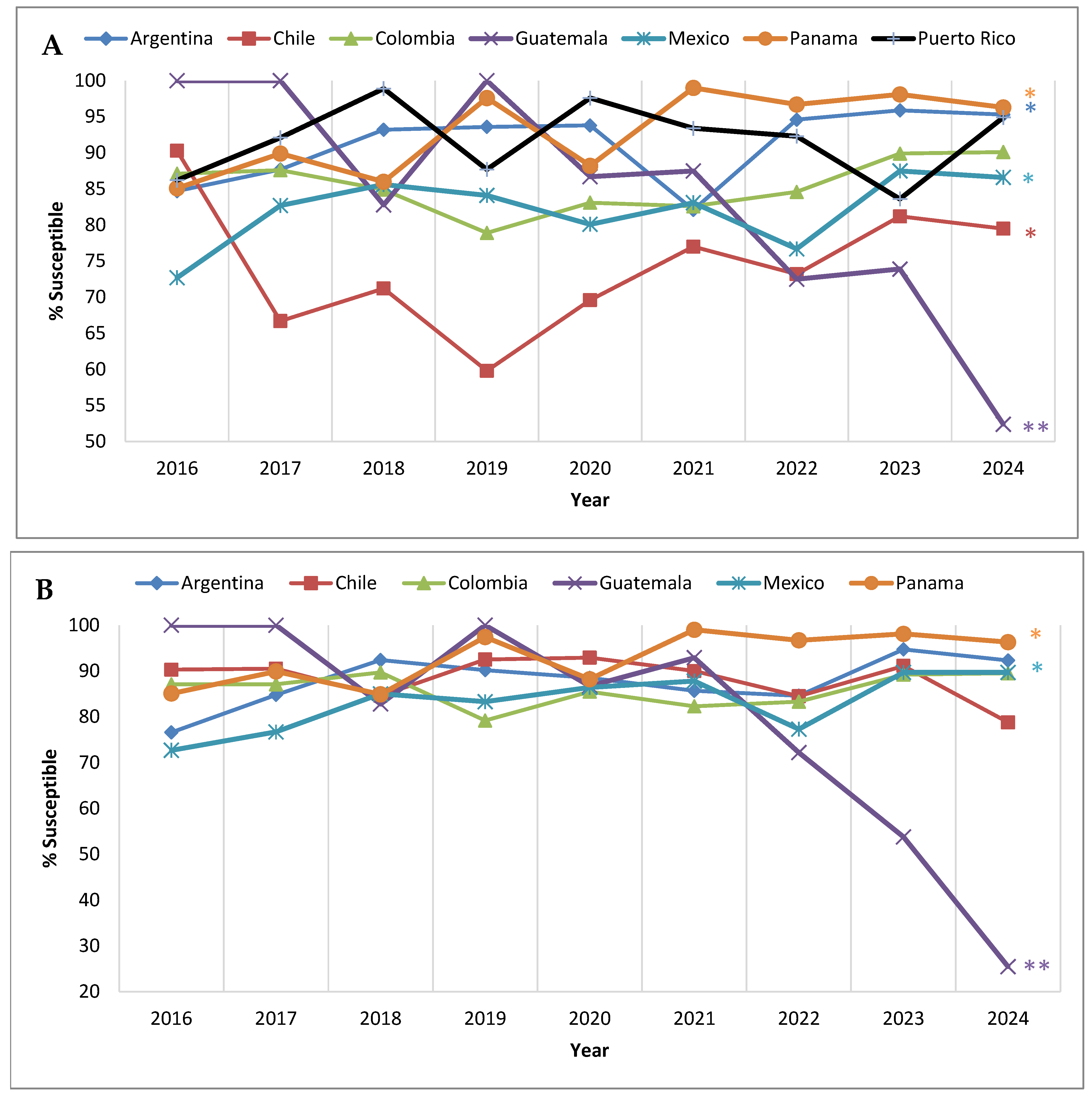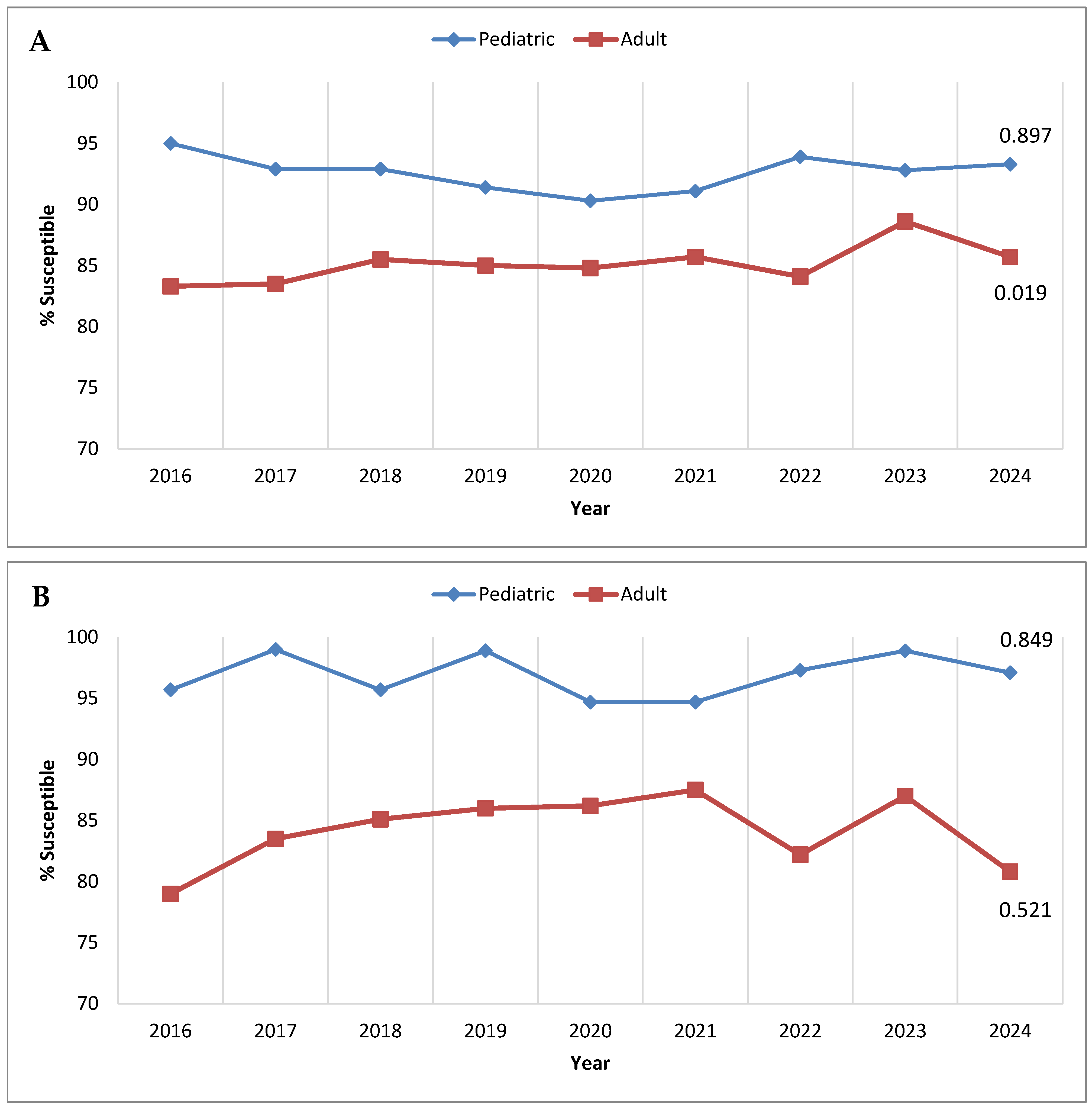 APA StyleWise, M. G., Karlowsky, J. A., Polis, T. J., Siddiqui, F., Young, K., Motyl, M. R., & Sahm, D. F. (2025). Trends in Pseudomonas aeruginosa In Vitro Susceptibility to Ceftolozane/Tazobactam in Latin America: SMART Surveillance Program, 2016–2024. Antibiotics, 14(10), 1018. https://doi.org/10.3390/antibiotics14101018