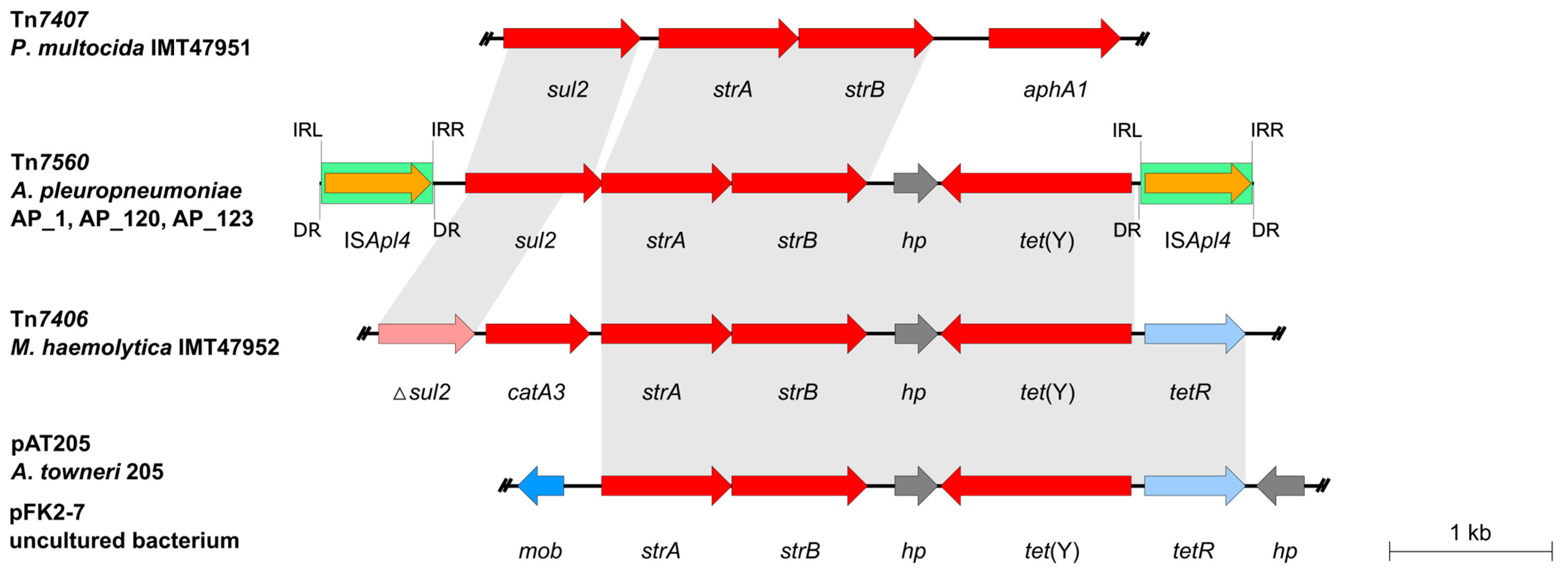 - da Silva, G.C.; Gonçalves, O.S.; Rosa, J.N.; França, K.C.; Bossé, J.T.; Santana, M.F.; Langford, P.R.; Bazzolli, D.M.S. Mobile Genetic Elements Drive Antimicrobial Resistance Gene Spread in Pasteurellaceae Species. Front. Microbiol. 2021, 12, 773284. [Google Scholar] [CrossRef]