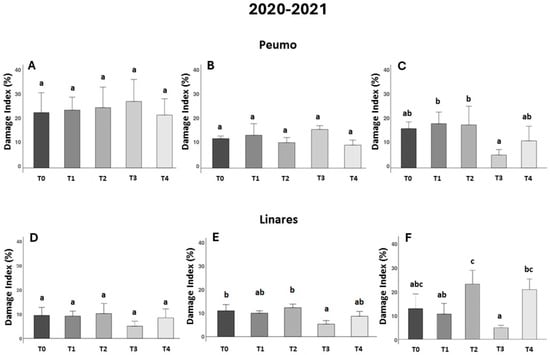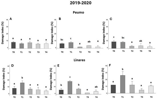 In Peumo, the effect of farmer management (T1) was not different from that of the control (T0) at 30, 45, and 90 DAA (Figure 1A–C). In the trial conducted in Linares, the data showed consistently worse effects of farmer management (Figure 1D–F). This treatment increased the damage index significantly in comparison to the control treatment (T0).