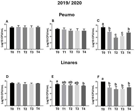 Epiphytic bacterial populations. Samples were evaluated before treatment application, 30 days after treatment application (DAA), and 60 DAA in Peumo (A–C) and Linares (D–F). The total bacterial population (CFU/mL) per plate was quantified. Each sample pool was processed individually by plate dilution of a homogenate prepared from 10 leaves. (T0) Control only water; (T1) Farmer’s management; (T2) Phage formulation 1; (T3) Phage formulation 2; (T4) Farmer’s management intercalated with phage formulation 2. Error bars represent standard deviations. Different letters above the bars indicate statistical differences among treatments according to Turkey’s HSD test (p < 0.05).