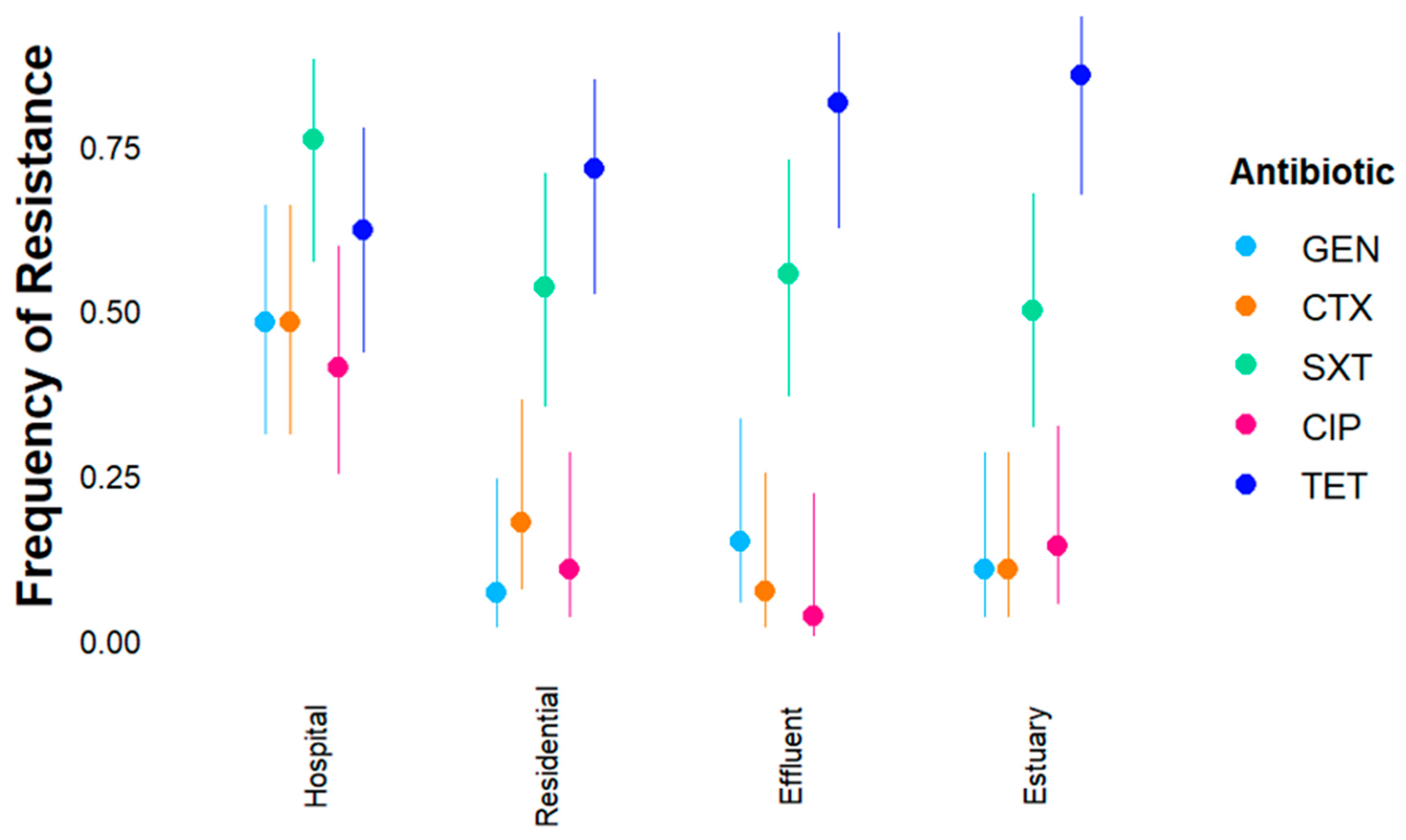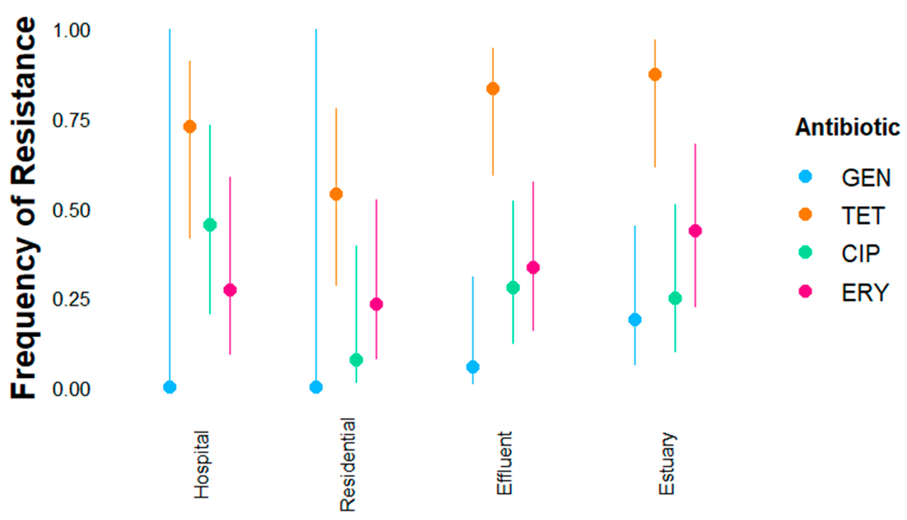 2.3. Multidrug Resistance in Wastewater, Effluent, and the Estuary