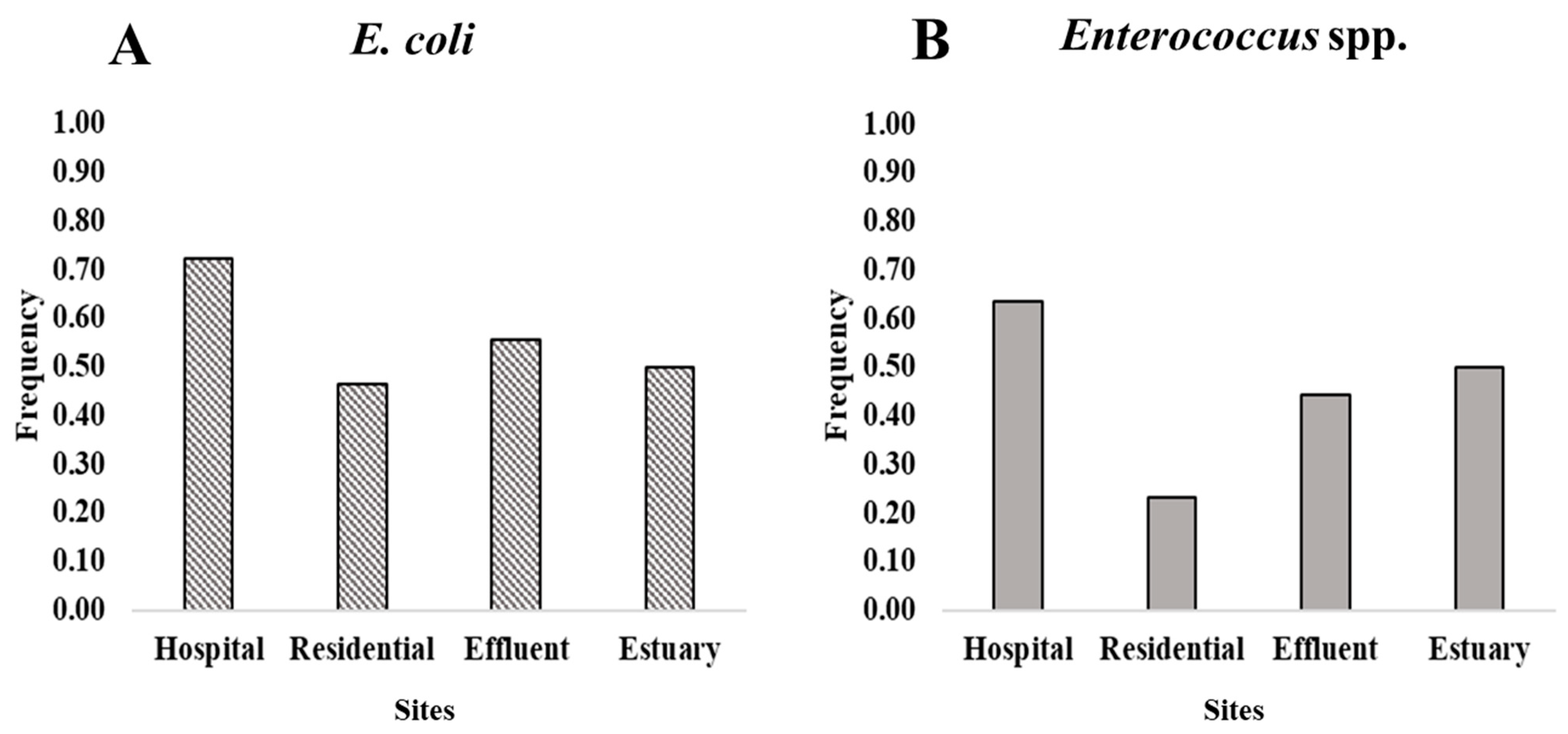 3.3. Multidrug Resistance of E. coli and Enterococcus in Wastewater, Effluent, and the Estuary