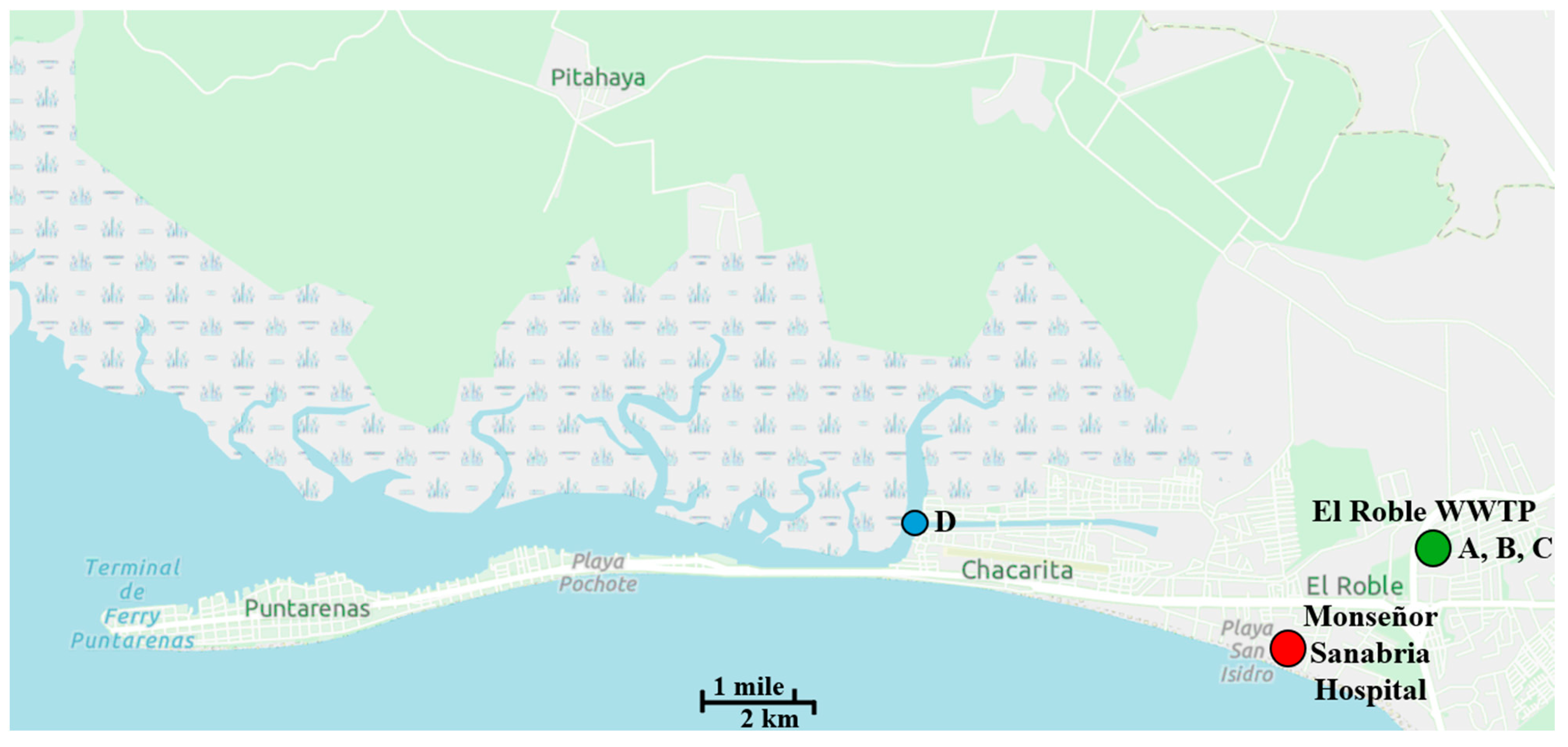 appear on map. Sampling stations are designated: (A) hospital wastewater, (B) residential wastewater, (C) treated effluent, and (D) Puntarenas estuary