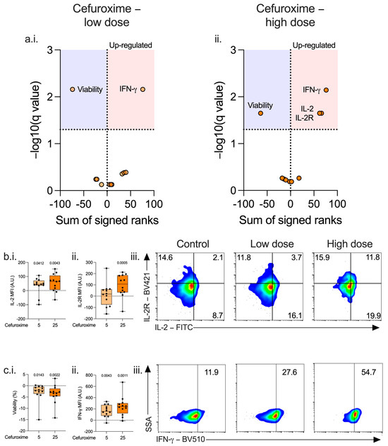 Effect of cefuroxime on lymphocyte immunophenotype. PBMCs isolated from patients immediately post-operatively (n = 12) were incubated for 72 h alone or with low (5 μg/mL, (a.i.), light orange) or high (25 μg/mL, (a.ii.), dark orange) doses of cefuroxime and the effect on CD4+ lymphocyte immunophenotype assessed. Data expressed as volcano plots generated by calculating a corrected q-value (−log10) using a False Discovery Rate (FDR) of 5% using the two-stage step-up method of Benjamini, Krieger, and Yekutieli. Red area represents markers upregulated by cefuroxime compared to control, blue area those markers downregulated. A dose-dependent effect was seen on IL-2 concentration (b.i.,b.iii.), IL-2R expression (b.ii.,b.iii.), viability (c.i.), and IFN-γ concentration (c.ii.,c.iii.). Data expressed as box and whisker plots normalised to control; dot represents the individual patient, horizontal line the median, box the interquartile range, and whisker the range, compared using Friedmans test (only p < 0.05 show) or as contour plots, where numbers represent percentage.