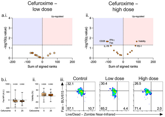 Effect of cefuroxime on Th1 lymphocyte immunophenotype. PBMCs isolated from patients immediately post-operatively (n = 16) were incubated for 72 h alone or with low (5 μg/mL, (a.i.), light orange) or high (25 μg/mL, (a.ii.), dark orange) doses of cefuroxime and the effect on Th1 lymphocyte immunophenotype (a.,b.) assessed. Data expressed as volcano plots generated by calculating a corrected q-value (−log10) using a False Discovery Rate (FDR) of 5% using the two-stage step-up method of Benjamini, Krieger and Yekutieli. Red area represents markers upregulated by cefuroxime compared to control, blue area those markers downregulated. A dose-dependent effect was seen on the Th1 population Fas receptor expression (b.i.) and viability (b.ii.). Data expressed as box and whisker plots normalised to control, dot represents the individual patient, horizontal line the median, box the interquartile range, and whisker the range, compared using Friedmans test (only p < 0.05 show) or as contour plots, where numbers represent percentage (b.iii.).