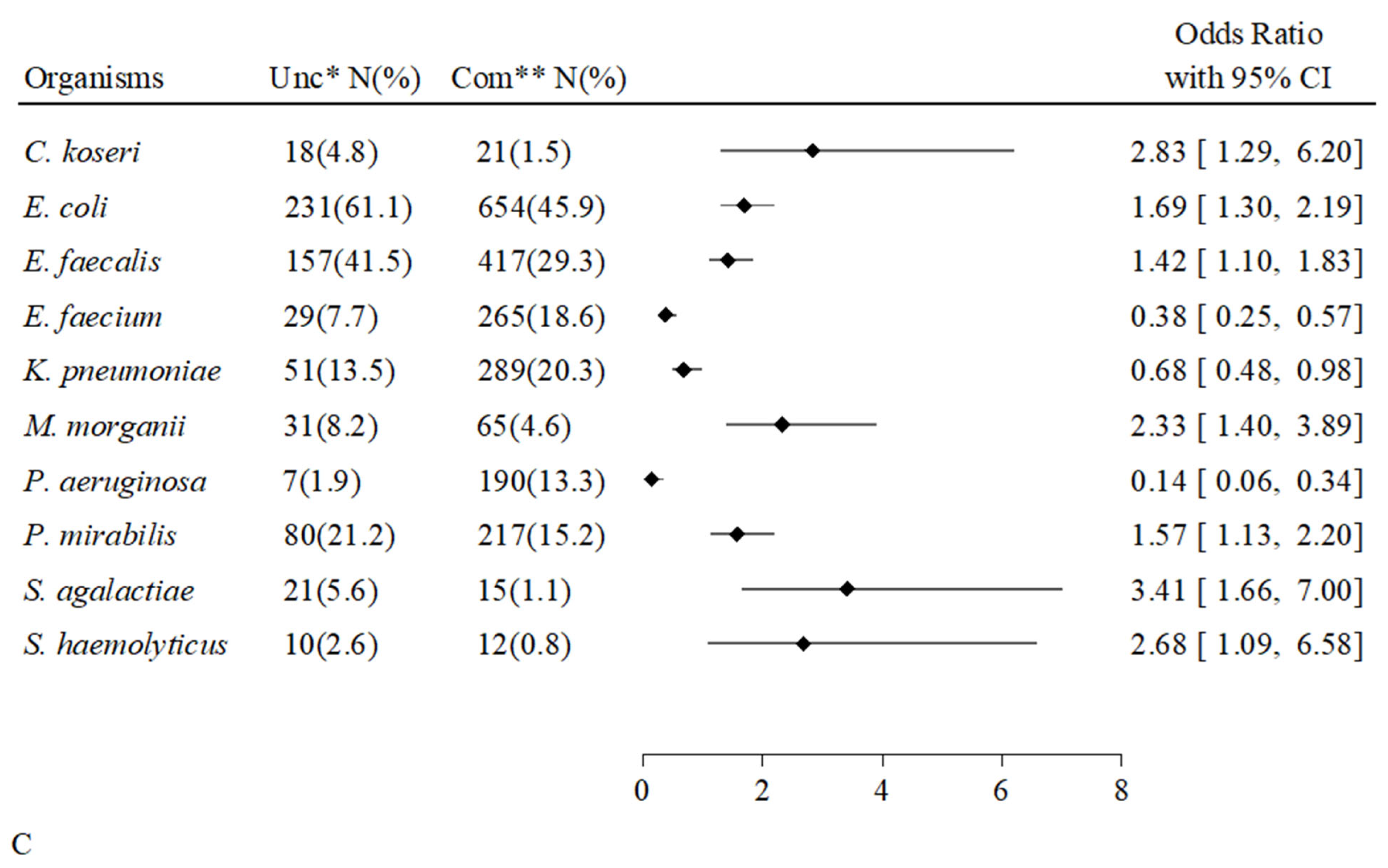 P. mirabilis | 1 | 0.62 (0.44–0.88) | 2.87 (2.29–3.6) | 4.23 (3.05–5.86) |