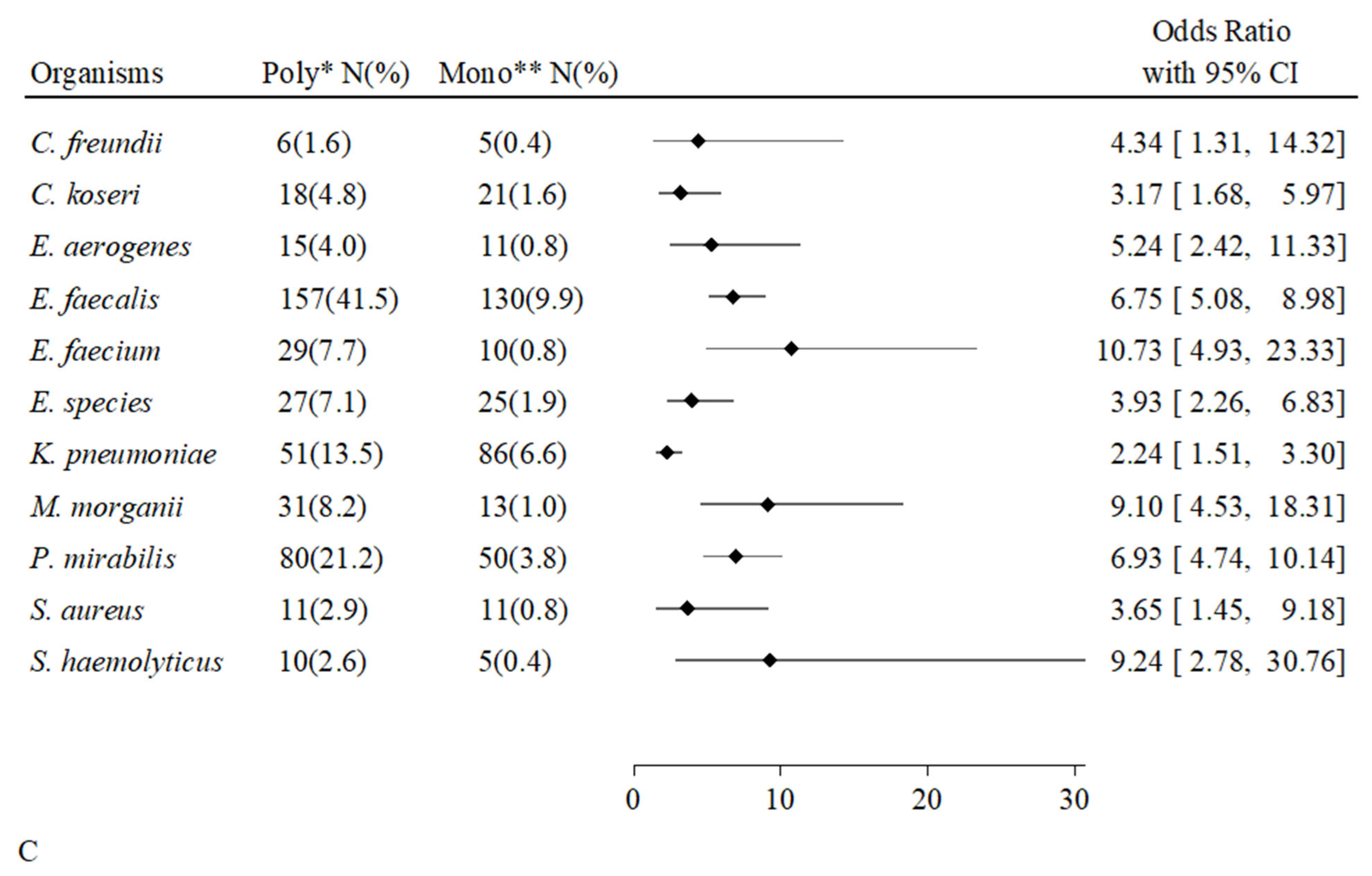 M. morganii | 1 | 0.99 (0.51–1.91) | 3.63 (2.44–5.39) | 9.03 (5.5–14.82) |