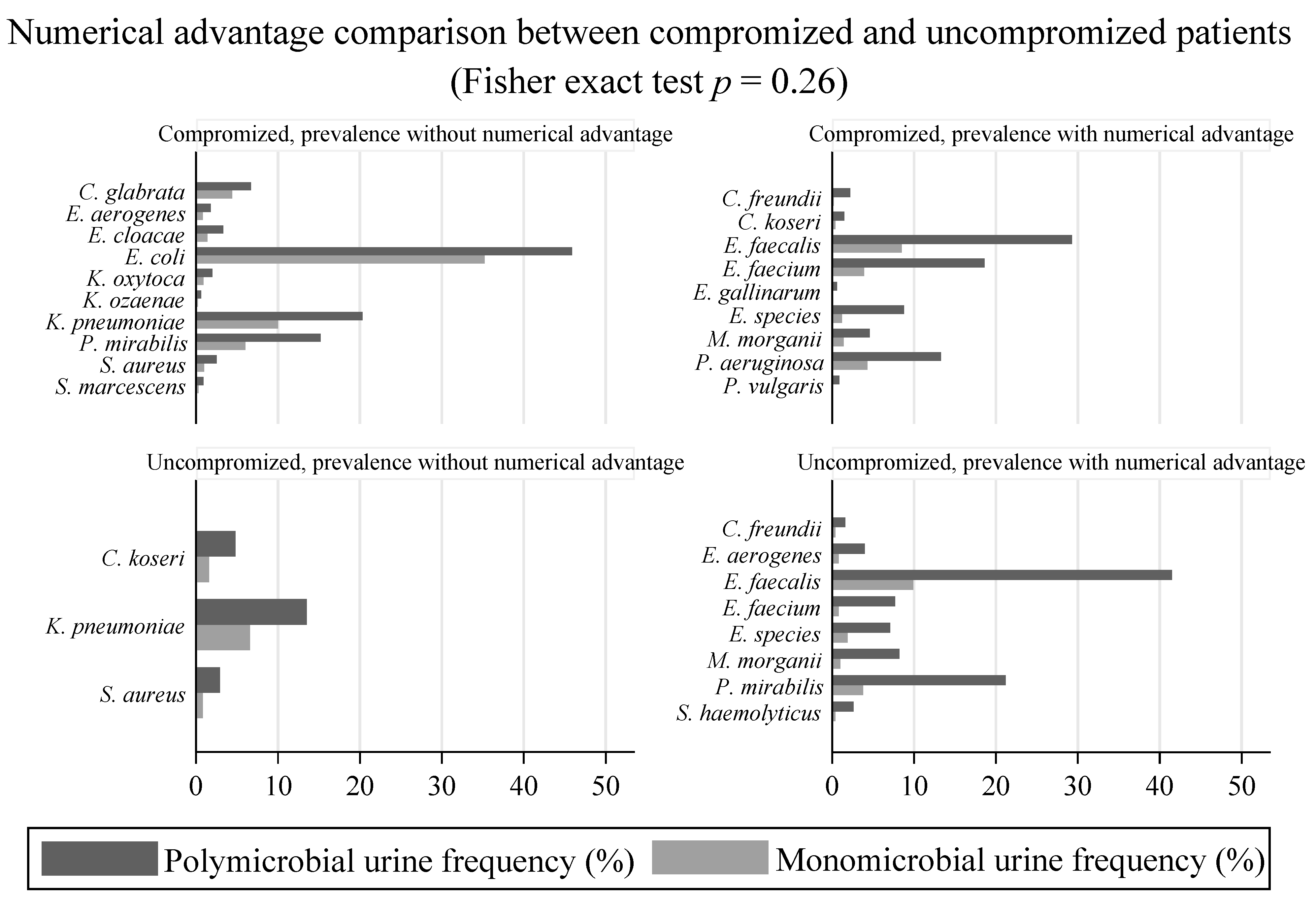 2.3. Urinary Microbial Positivity, Frequency of Species Present and Number of Different Paired Organisms