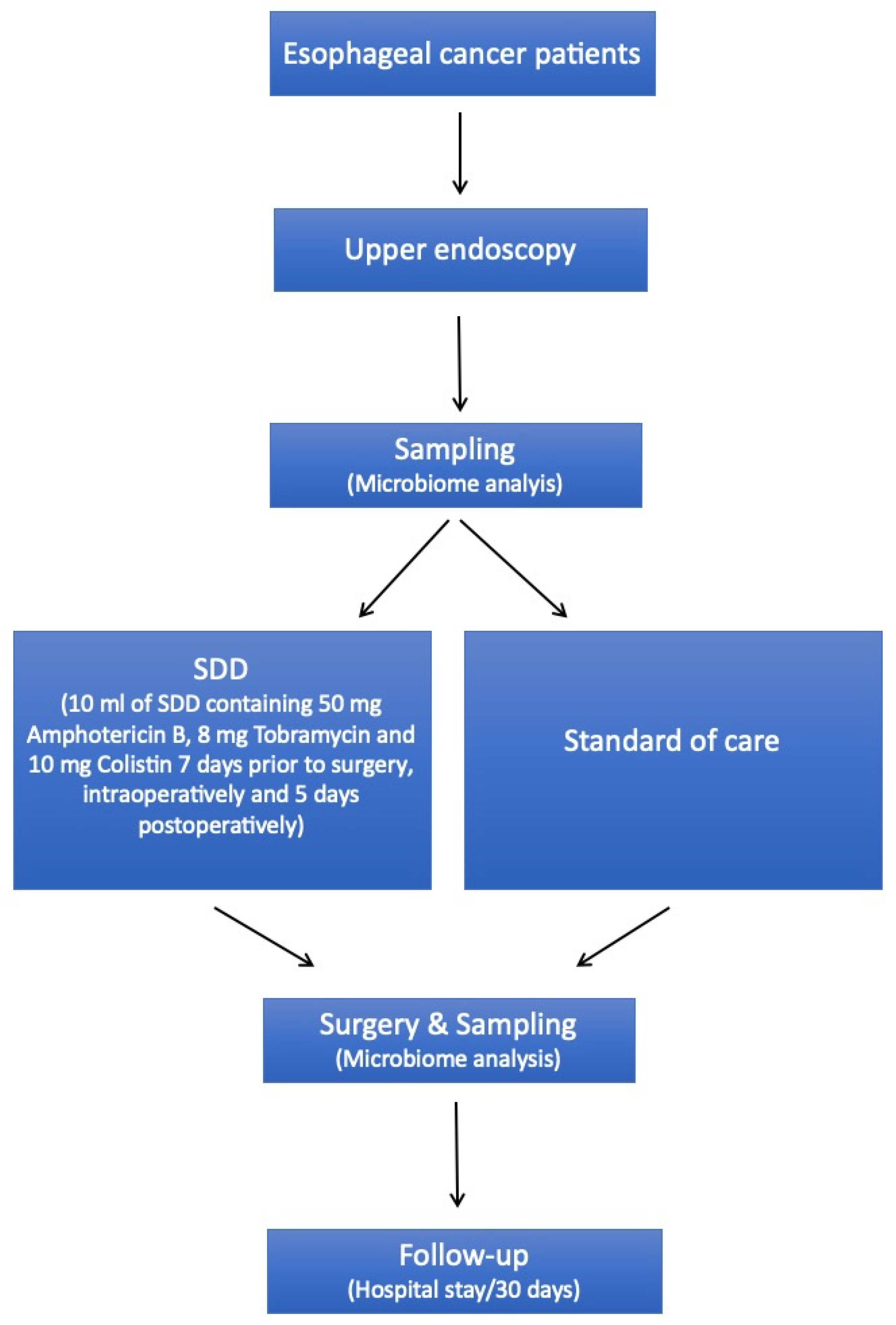 Klose, J.; Lehr, K.; Ronellenfitsch, U.; Klose, M.A.; Ebert, D.; Rebelo, A.; Link, A.; Kleeff, J. Selective Oral Decontamination of the Esophagus to Reduce Microbial Burden in Patients Undergoing Esophagectomy for Esophageal Cancer (SODA)—First Results from a Proof-of-Principle Study. Antibiotics 2025, 14, 1033. https://doi.org/10.3390/antibiotics14101033