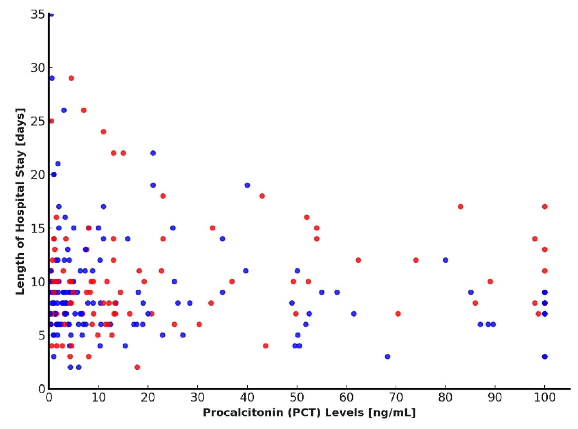 Figure 5). Collectively, these results suggest that although the linear relationship between PCT and hospital length of stay appears minimal, patients with higher PCT levels tend to remain hospitalized longer, indicating a potential role for PCT as a marker of clinical severity. Nevertheless, the considerable variability in the data implies the presence of additional influencing clinical factors. Further multivariate analysis is warranted to better delineate the interplay between PCT and other determinants of hospitalization duration.