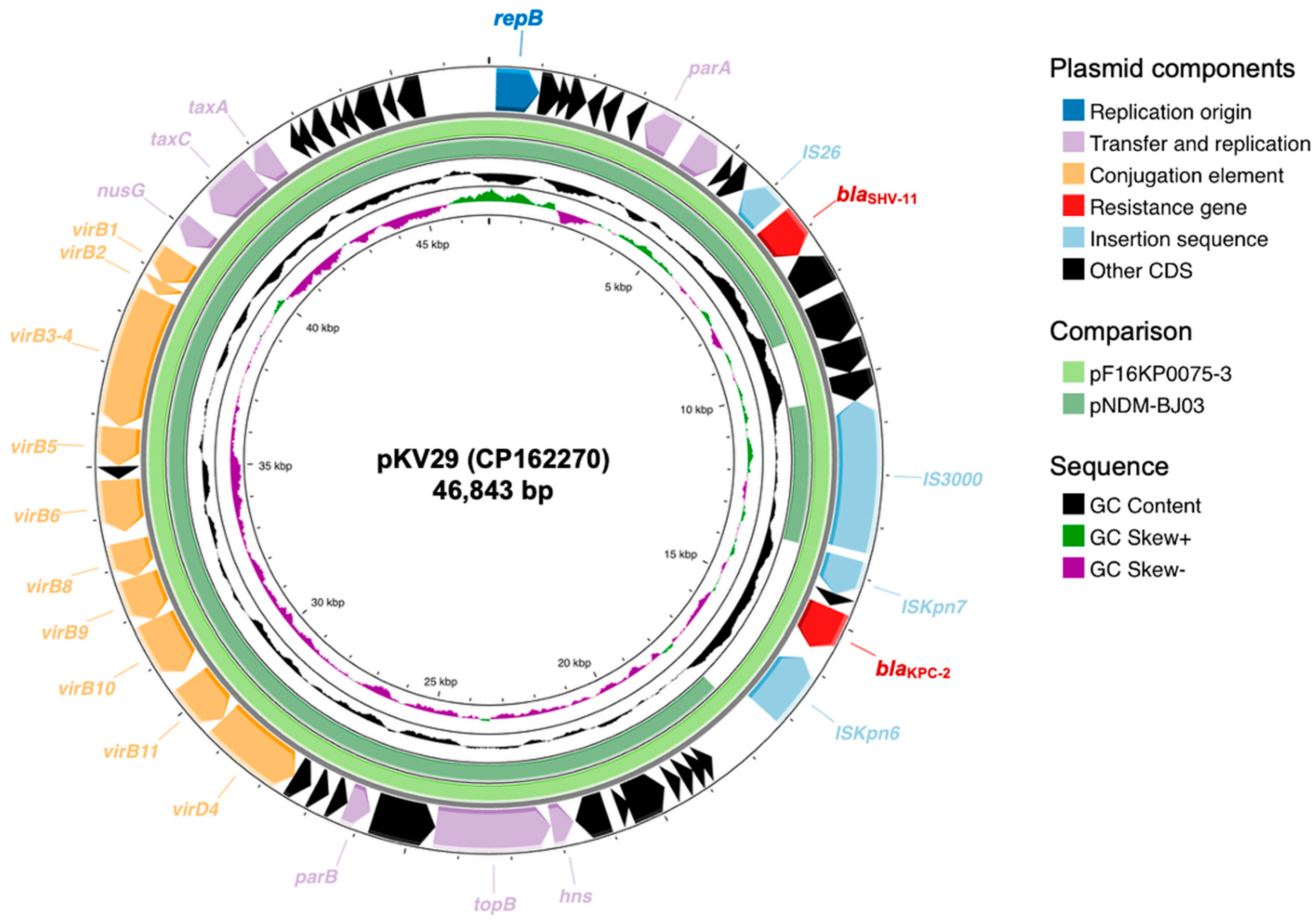 Figure 3. Schematic map of pKV29. From the outside, the outermost circle presents the open reading frames of pKV29. The colors of arrows were classified according to the function of each gene, including blue for replication origin, light purple for transfer and replication, yellow for conjugation, red for resistance, and light blue for insertion sequences. The inner two circles with emerald and light green indicate the regions that showed homology (>99% nucleotide similarity) with the plasmids published previously (pF16KP0075-3, GenBank accession: CP052170.1; pNDM-BJ03, GenBank accession: JX104760.1). The innermost circles present GC content and GC skew.