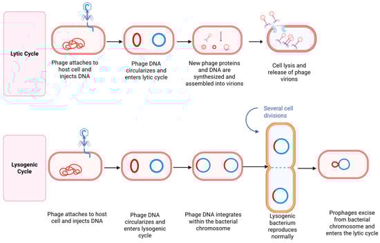Bacteriophages are viruses that selectively infect and lyse bacterial cells, functioning as highly host-specific bacterial parasites. Due to their targeted antimicrobial activity, they are increasingly recognized as a promising alternative to conventional antimicrobials, contributing to enhanced food safety and security. This diversity in form and function underpins their versatility in biotechnology, diagnostics, and antimicrobial therapy. Bacteriophages can specifically infect and lyse bacterial cells through a highly targeted process, as illustrated in Figure 3. Upon encountering a susceptible host, the phage attaches to bacterial surface receptors using tail fibers or other specialized structures. It then injects its genetic material, either DNA or RNA into the bacterial cytoplasm, hijacking the host’s replication machinery to produce viral components [236]. In the lytic cycle, newly assembled phage particles accumulate until the host cell undergoes lysis, releasing progeny phages to infect neighboring bacteria. Alternatively, in the lysogenic cycle, the phage genome integrates into the host chromosome and replicates passively until triggered to enter the lytic phase [236,237]. For therapeutic purposes, only strictly lytic phages are considered suitable, as temperate phages capable of lysogeny may contribute to horizontal gene transfer and bacterial persistence, making them undesirable in clinical applications.