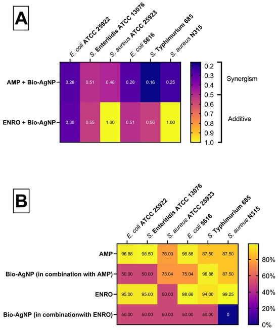 (A) Heatmap of the FICI values and antibacterial interaction. (B) Heatmap of the percentage reduction in the MIC value of the combinations.