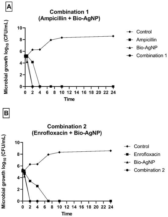 Time–kill assay of Escherichia coli treated with (A) ampicillin, Bio-AgNP, and combination 1 and with (B) enrofloxacin, Bio-AgNP and combination 2.