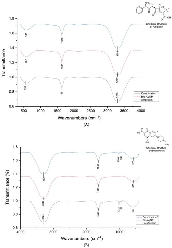 FTIR analysis of Bio-AgNP, antibiotics and combined treatments. (A) Spectra of Bio-AgNP, ampicillin and combination 1. (B) Spectra of Bio-AgNP, enrofloxacin and combination 2. Transmission spectra of the BioAgNP–antibiotic combination were similar to those of non-combined Bio-AgNP and antibiotics.