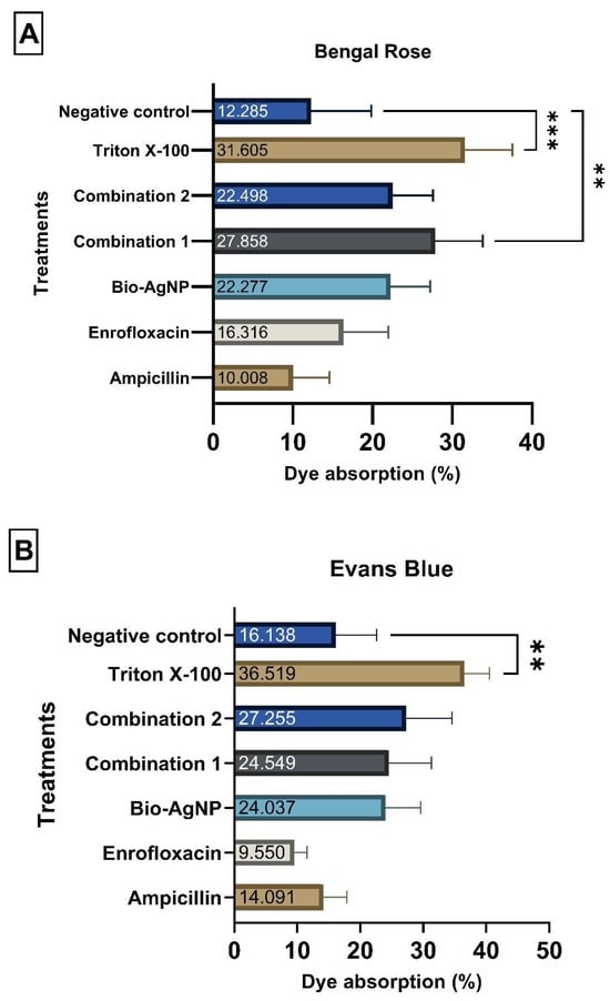 Absorption assay of Rose Bengal (A) and Evans Blue (B) dyes to analyze changes in membrane permeability in Escherichia coli ATCC 25922. **: p-value < 0.01. ***: p-value < 0.001.