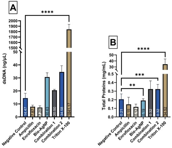 (A) Analysis of dsDNA leakage from Escherichia coli ATCC 25922 after treatments with Ampicillin, Enrofloxacin, Bio-AgNP, Combination 1, and Combination 2. (B) Analysis of Total Protein leakage from Escherichia coli ATCC 25922 after treatments with Ampicillin, Enrofloxacin, Bio-AgNP, Combination 1, and Combination 2. The positive control exhibited markedly higher values compared to the other groups. To improve clarity, the y-axis was segmented (discontinuous). Method used for data transformation: (A) Square root. (B) Negative Logarithmic. **: p-value < 0.01. ***: p-value < 0.001. ****: p-value < 0.0001.