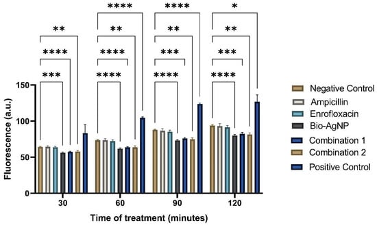 When comparing the individual treatments, it was observed that ampicillin and enrofloxacin exhibited values close to the negative control throughout the readings, confirming that these treatments do not operate via oxidative stress. After 2 h, ampicillin showed 93.12 AU, enrofloxacin showed 91.60 AU, and the negative control was 93.90 AU, demonstrating that the absolute values were very similar. However, no detectable increase in ROS level was observed in treatments with ampicillin and enrofloxacin. Bio-AgNP exhibited lower values compared to the negative control in all readings. After 2 h, Bio-AgNP measured 80.22 AU, while the negative control was 93.90 AU, indicating that this compound reduces ROS production. All time points showed a statistically significant difference when comparing the negative control (PBS) with Bio-AgNP.