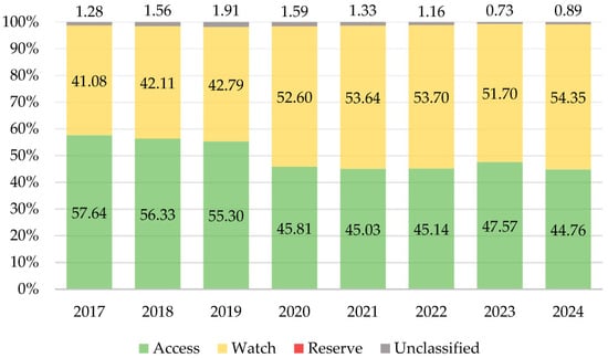 Antibiotic consumption by the categories of AWaRe classification, 2017–2024 (%).