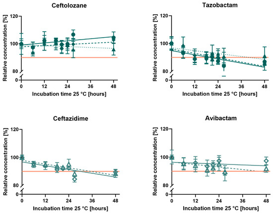 Relative concentrations of ceftazidime, avibactam, ceftolozane, and tazobactam in elastomeric pumps containing 240 mL ceftazidime-avibactam or ceftolozane-tazobactam in 0.9% saline during 48 h of incubation at 25 °C. All pumps were prepared in triplicate at each concentration, and mean concentrations (±standard deviation) of all three pumps were plotted. The horizontal orange line indicates the stability threshold of 90%. The results of the different dosages of ceftolozane + tazobactam are shown with filled triangles and a dashed regression line for 2.25 g (concentration 6.25 + 3.13 g/L), filled rhombuses and a solid regression line for 4.5 g (concentration 12.5 + 6.25 g/L), and filled circles and a dotted regression line for 9.0 g pumps (concentration 25.0 + 12.5 g/L). Results of ceftazidime + avibactam pumps are shown with open triangles and a dashed line for 3.75 g (concentration 12.5 + 3.13 g/L) and open rhombuses and a solid regression line for 7.5 g (concentration 25.0 + 6.25 g/L).