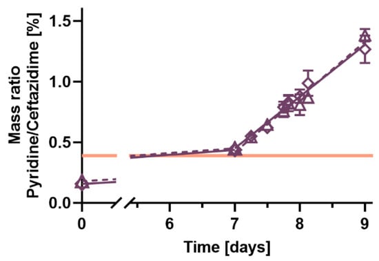 Ceftazidime and avibactam concentrations stayed above 90% for both tested concentrations, 3.75 and 7.5 g ceftazidime-avibactam in 240 mL 0.9% saline, during 24 h of incubation at 25 °C (Figure 1). The toxic degradation product pyridine reached the Ph. Eur. limit of 0.4% pyridine per ceftazidime (w/w) before the end of the 7-day storage at 2–8 °C, potentially before application to patients (Figure 2). The total pyridine amount formed in the elastomeric pumps after 7 days of storage at 2–8 °C and 24 h incubation at 25 °C was 24 mg pyridine in the elastomeric pumps containing 3.75 g ceftazidime-avibactam and 53 mg pyridine in the 7.5 g ceftazidime-avibactam pumps, respectively.