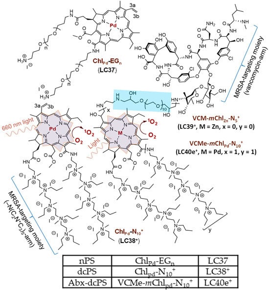 Several classes of PS compounds have been developed and investigated over the years as antimicrobial inactivators [19,20,21,22,23,24]. Among them, porphyrin, benzoporphyrin, chlorin, and texaphyrin analogous derivatives are the most common PSs used in cancer and tumor therapy studies. In the case of aPDI, an additional class of polycationic fullerene (C60 or C70) monadduct or bisadduct derivatives has been demonstrated as photoresponsive PSs (C60/70PSs) in related treatments, with the potential application of O2-independent aPDI using an activated intermolecular or intramolecular electron (e−)-transfer photomechanism [25,26,27,28,29]. Moreover, considering the charge factor parameter and the upper limit of charge number as a threshold for achieving optimal efficiency in biocidal action—which may lead to loss of cell viability—certain explorations were carried out by us using photosensitizing cationic chlorin derivatives [30]. In this study, we applied a similar, well-defined decacationic strategy to target MRSA involving a combination of interactive H-bonding and surface static charge interactions as a multiple binding-sites approach to extend the binding area. This approach was proposed to partially overcome the chemical alternation and transformation of –L-Lys-D-Ala-D-Ala to –L-Lys-D-Ala-D-lactate by bacteria during mutation processes [31]. The targeting ability is based on the highly negatively charged nature of lipopolysaccharides (phosphate and carboxylic acid anions) at the outer membrane surface of the Gram-negative bacterial cell wall and anions of teichoic acid and terminal carboxylic acids of the outer thick peptidoglycan layer of the Gram-positive bacterial cell wall. It is in addition to the simulation of H-binding moieties of vancomycin to the bacterial cell wall [32,33]. Vancomycin was selected for this study for several reasons. Its chemical structure allows selective modification without compromising molecular integrity, due to the presence of a single primary amine that facilitates conjugation. It also exhibits strong targeting ability against methicillin-resistant bacteria such as MRSA, making it a reliable choice for our investigation. Furthermore, in addition to enhancing antibacterial photodynamic inactivation (aPDI), vancomycin may provide a delayed antibiotic effect after light treatment, offering the potential to prevent the recurrence of infections. The targeting combination by design and synthesis may significantly increase the number of multi-binding sites to most Gram-positive bacterial cells. Accordingly, we demonstrated the cell-targeting ability differentiation between two aPDI agent molecules, the decacationic photosensitizer (dcPS) Chlpd-N10+ (LC38+) and the antibiotic decacationic photosensitizer (Abx-dcPS) VCMe-mChlpd-N10+ (LC40e+), as shown in Figure 1, on MRSA cells, using a neutral photosensitizer (nPS) Chlpd-EGn (LC37) only serving as the reference compound for comparison of targeting ability.