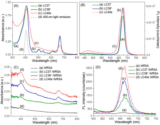 (A) UV-vis spectra of (a) LC37, (b) LC38+, (c) LC40e+, and (d) the emission spectrum of 405 nm LED light used in in vitro experiments and (B) fluorescence (FL) spectra (λex 410 nm) of (a) LC37, (b) LC38+, and (c) LC40e+ in DMF at a concentration of 2.0 × 10−5 M. (C) Normalized UV-vis spectra of (a) MRSA alone and MRSA pretreated with (b) LC37, (c) LC38+, and (d) LC40e+ in the same concentration of 200 µM. (D) Normalized fluorescence emission spectra (λex 410 nm) of (a) MRSA alone and MRSA pretreated (200 µM) with (b) LC37, (c) LC38+, and (d) LC40e+. Both (C,D) were taken in a solution of anhydrous acetone in a concentration as prepared after fixation with paraformaldehyde and glutaraldehyde. Normalization calculation was performed using the measured extinction coefficient (ε) value to an effective number of dcPS or Abx-dcPS molecules and MRSA cell counts per mL obtained by flow cytometric analysis.