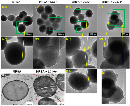 TEM images of (a1,a2) MRSA cells alone and MRSA cells pretreated with (b1,b2) LC37, (c1–c3) LC38+, and (d1–d3) LC40e+ in a concentration of 200 µM, where two or three different magnifications were displayed to show the extracellular binding of nPS (b1,b2), dcPS (c1–c3), or Abx-dcPS (d1–d3). (e) A bladed microtome slice section of an MRSA sample in the Epon t812 polymer matrix for comparison of morphological changes with those of (f) the similar slice section of MRSA pretreated with LC40e+ (200 µM), showing many physically attached Abx-dcPS at different locations, as marked by red arrows, clearly differentiable from (e).