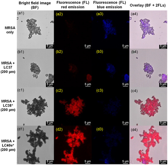 Confocal microscopic images of (a1–a4) MRSA cells alone and MRSA cells pretreated with (b1–b4) LC37, (c1–c4) LC38+, and (d1–d4) LC40e+ in a concentration of 200 µM, where four separated columns were displayed to show the images under either bright field (left), FL red emission (640–780 nm, middle left), FL blue emission (450–550 nm, middle right), or overlay of all three fields in the last column on the right. In all cases, the irradiation excitation at 405 nm was applied.