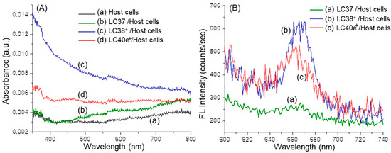 (A) Normalized UV-vis spectra of (a) host cells alone and host cells pretreated with (b) LC37, (c) LC38+, and (d) LC40e+ in the same concentration of 200 µM. (B) Normalized fluorescence emission spectra (λex 410 nm) of host cells pretreated (200 µM) with (a) LC37, (b) LC38+, and (c) LC40e+. Both (A,B) were taken in a solution of anhydrous acetone in a concentration as prepared after fixation with paraformaldehyde and glutaraldehyde. Normalization calculation was performed using the measured extinction coefficient (ε) value to an effective number of dcPS or Abx-dcPS molecules and host cell counts per mL obtained by flow cytometric analysis.