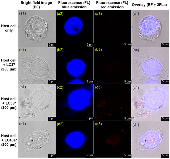 Confocal microscopic images of (a1–a4) host cells alone and host cells pretreated with (b1–b4) LC37, (c1–c4) LC38+, and (d1–d4) LC40e+ in a concentration of 200 µM, where four separated columns were displayed to show the images under either bright field (left), blue FL emission (450–550 nm, middle left), red FL emission (640–780 nm, middle right), or an overlay of all three fields in the last column on the right. In all cases, the irradiation excitation at 405 nm was applied.