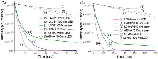 Consequently, under all three light sources of white LED, 400 nm LED, and 650 nm laser used for the irradiation of dcPS (LC38+) and Abx-dcPS (LC40e+), rapid loss of the fluorescent emission intensity of ABMA was observed in Figure 7A,B, respectively. An ABMA probe solution without dcPS was evaluated for the comparison purpose. Apparently, slow slight photodegradation of the ABMA molecule in DMF–H2O (1:9, v/v) was observed (Figure 7A(d–f),B(d–f)) depending on the effective irradiant fluence of light applied on the solution, where white LED (2.0 W) light was higher than those of 400 nm LED (320 mW) and 650 nm laser (200 mW) lights. Similar fluorescent emission intensity decreasing trends were detected with the decreasing order by Figure 7A(a),B(a) > Figure 7A(b),B(b) > Figure 7A(c),B(c), based on the curve-slope change. The nonlinearity of all curves may be caused by a progressive decrease in the ABMA concentration in solution. By comparison between either Figure 7A(a),B(a) or Figure 7A(b),B(b), the fluorescence intensity decreasing rate was faster for the latter, reaching nearly zero within 75 or 125 sec of irradiation, respectively, indicating a more rapid and higher production quantity of 1O2 for LC40e+ than LC38+ under the same light wavelength and irradiance exposure. These photophysical characteristics should lead to better performance of LC40e+ in aPDI efficacy than LC38+.