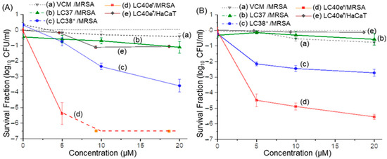 In vitro aPDI activities of (a) vancomycin alone, (b) LC37, (c) LC38+, and (d) LC40e+ on planktonic MRSA IQ0064 cells under the dcPS or Abx-dcPS concentrations of up to 20 µM. Irradiation was carried out with (A) the radiant exposure of 115 J/cm2 at 660 nm (LED light, 40 mW/cm2) and (B) the radiant exposure of 20 J/cm2 at 405 nm (LED light, 24 mW/cm2). All experiments were conducted in three independent replicates. All data were represented as log10 survival fractions as a function of aPDI agent concentration, where the dashed red line in A(d) represents the detection limit of MRSA CFU. Human epithelial keratinocyte HaCaT cells were also included in the study, under the same experimental conditions, for the study of photocytotoxicity to human cells with the data in (e).