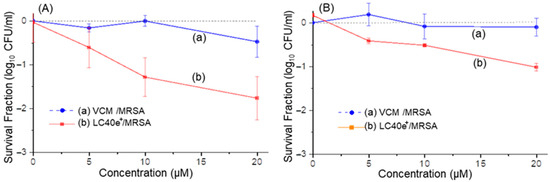 In vitro aPDI activities of LC40e+ on the 24 h-old biofilms of MRSA IQ0064 using a concentration of Abx-dcPS up to 20 µM, (a) dark control and (b) aPDI group. Irradiation was carried out with (A) the radiant exposure of 115 J/cm2 for 660 nm LED light (40 mW/cm2) and (B) the radiant exposure of 20 J/cm2 for 405 nm LED light (24 mW/cm2). All experiments were conducted in three independent replicates. All data were represented as log10 survival fractions as a function of both PS concentrations.
