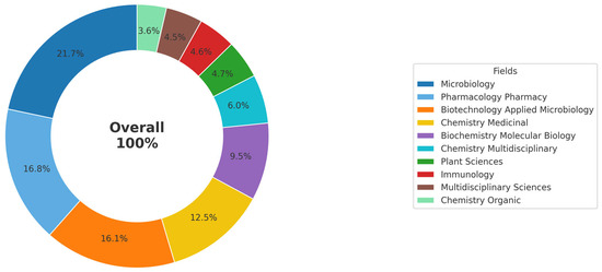 Figure 1. Percentage distribution of research areas for publications on Streptomyces as biofactories of antibiotics against Staphylococcus aureus (2015–2024). The figure highlights the predominance of the fields of Microbiology, Pharmacology and Pharmacy, as well as Biotechnology and Applied Microbiology, reflecting the interdisciplinary nature and complexity of research on this topic.