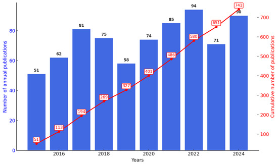 Figure 2. Annual and cumulative number of scientific publications on the use of Streptomyces to combat Staphylococcus aureus from 2015–2024. A clear upward trend is observed, especially since 2017, indicating a continuous and significant interest from the scientific community in this area.