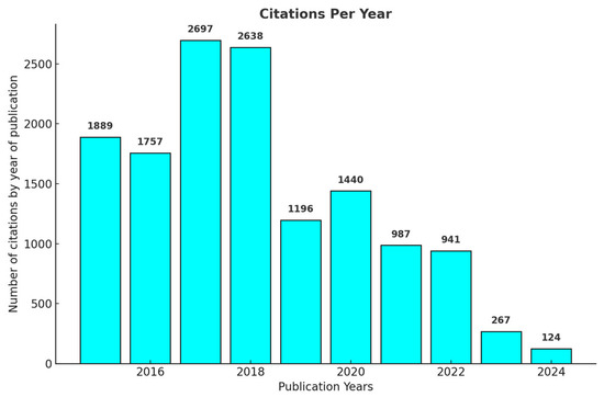 Figure 3. Number of citations received annually by articles published on the use of Streptomyces as producers of antibiotics against Staphylococcus aureus from 2015–2024. The figure shows a peak in citations in the first few years after publication, particularly in 2017 and 2018, followed by a gradual decrease.
