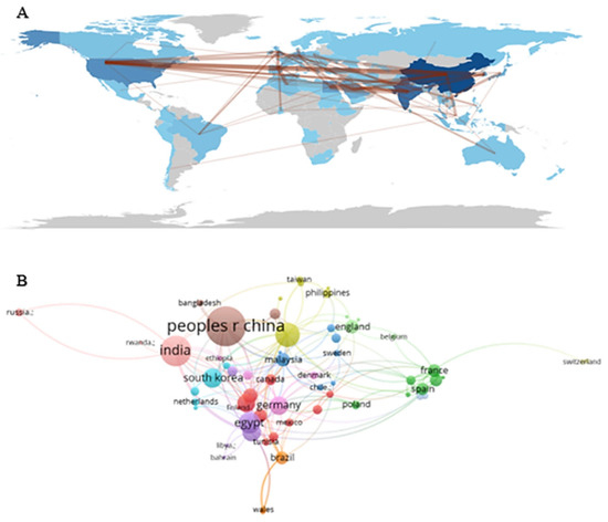 Figure 4. Global mapping (A) and international collaboration network (B) among countries that published research on Streptomyces as antibiotic biofactories against S. aureus. The world map visually shows the relative volume of publications by country, while the bibliometric network reveals specific relationships between nations, organized into 13 distinct clusters. China and India stand out as central hubs in international collaborations, reinforcing the leading role of these regions in natural product-based antimicrobial research.