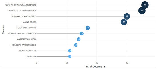 Figure 5. Leading scientific journals that have published articles related to the use of Streptomyces against Staphylococcus aureus. The figure highlights renowned and specialized journals, such as the Journal of Natural Products, Frontiers in Microbiology, Journal of Antibiotics, and Marine Drugs, indicating that these periodicals are considered the main channels for the dissemination of research related to the discovery of new antibiotic compounds.