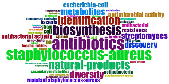 A word cloud with the main keywords identified in the articles related to the use of Streptomyces as biofactories of antibiotics against Staphylococcus aureus is presented in Figure 6. The words with higher frequency appear in proportionally larger size, indicating prominent relevance in the analyzed studies. Clearly, the terms “Staphylococcus aureus”, “antibiotics”, “biosynthesis”, “natural-products”, and “diversity” are the most prominent, highlighting the central focus of research in this area. This relevance confirms that the published studies predominantly focus on the identification, biosynthesis, and diversity of natural products obtained from Streptomyces with antibiotic activity, especially against the pathogen S. aureus, including resistant strains. Words like “antibacterial activity”, “identification”, “metabolites”, and “Streptomyces “ also emerge prominently, reflecting methodological aspects and predominant experimental approaches in the literature. The presented overview reveals important insights about current trends and the direction of studies focused on finding effective solutions against bacterial resistance through microbial biofactories.